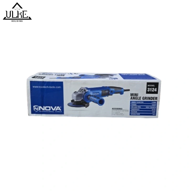مینی فرز دسته بلند دیمر دار نووا مدل NOVA 3124 با ظرفیت ۱۲۰۰ وات برقی و سایز صفحه 115 میلیمتری و ۱۲ ماه گارانتی : ایدهآل برای برش سنگ و فلز با کنترل سرعت